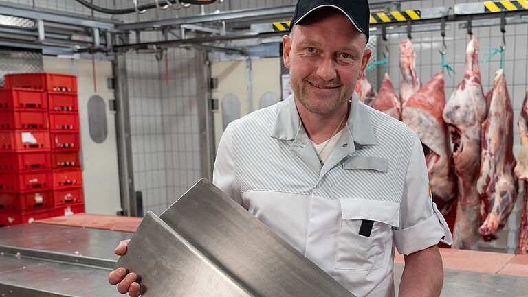Christian Holland wird in der Globus-Metzgerei interviewt: „Nachdem der Prototyp fertiggestellt war, haben wir ihn im Betrieb getestet. Die Ecken haben wir dann im Nachgang noch einmal abrunden lassen.“ In einem Zwischenschnitt sieht man das Schutzblech während des laufenden Betriebs.