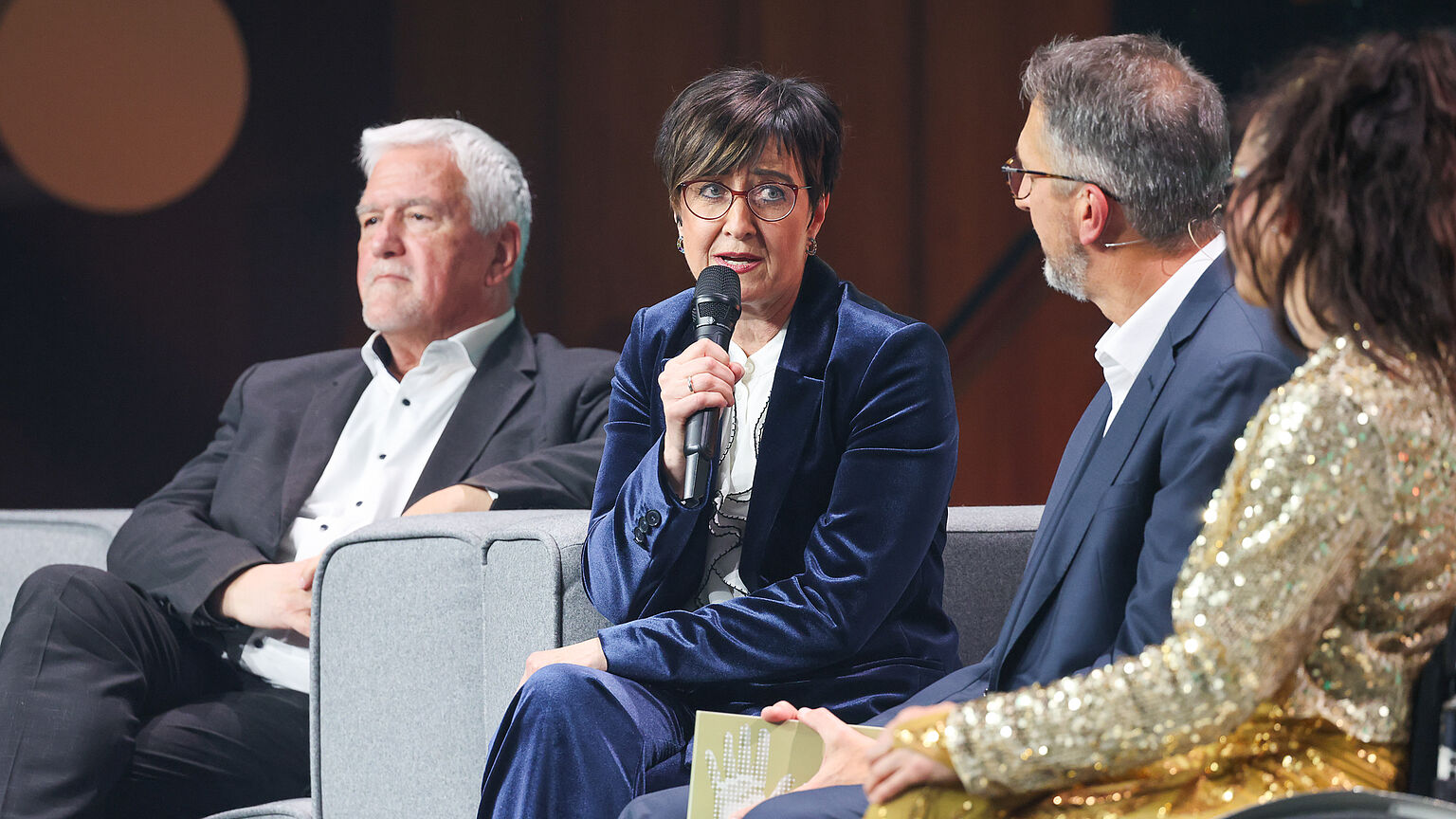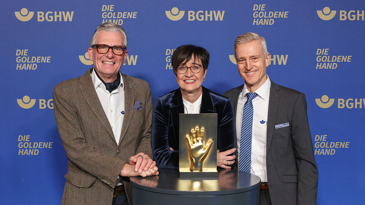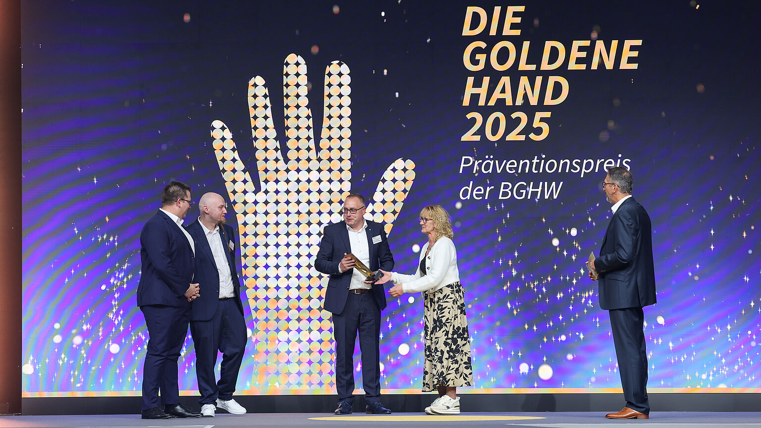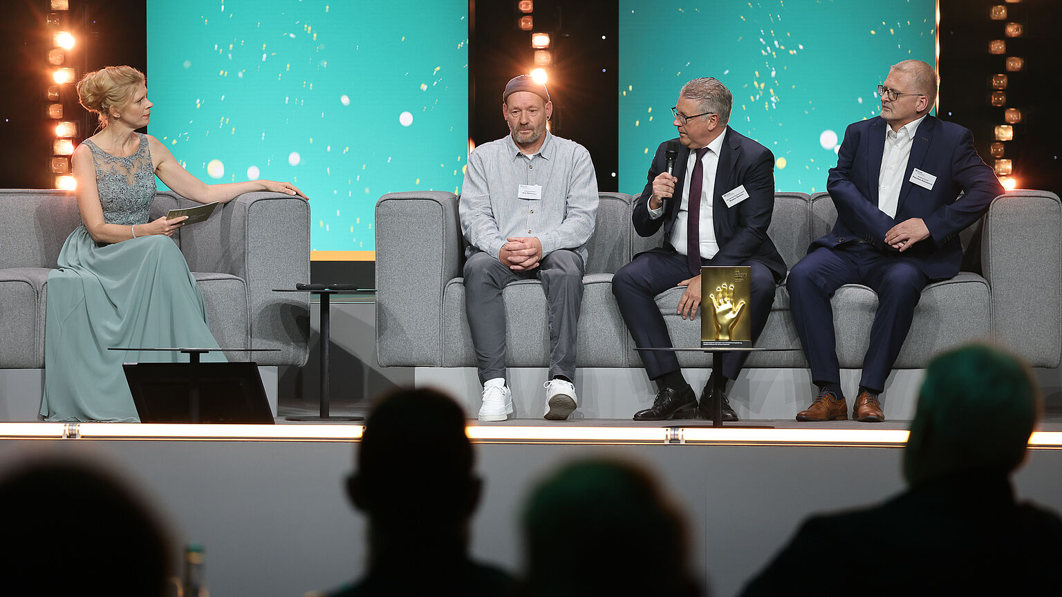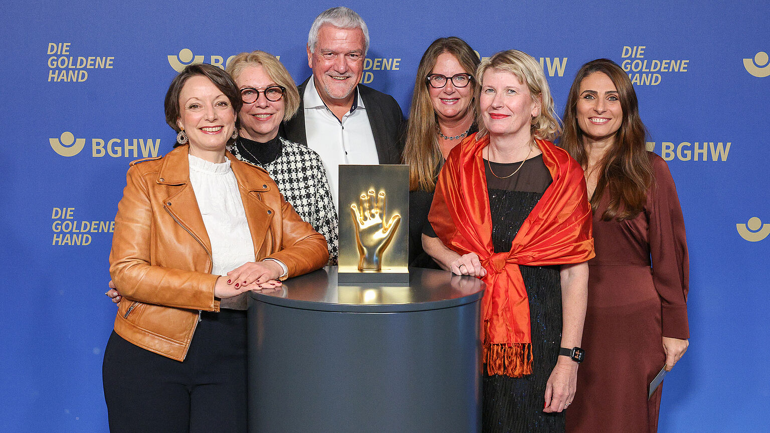 Die Preisträgerinnen und Preisträger der Goldenen Hand 2025 mit ihren Patinnen und Paten, sowie dem Moderationsduo Iris Stelter und Karl-Josef Thielen