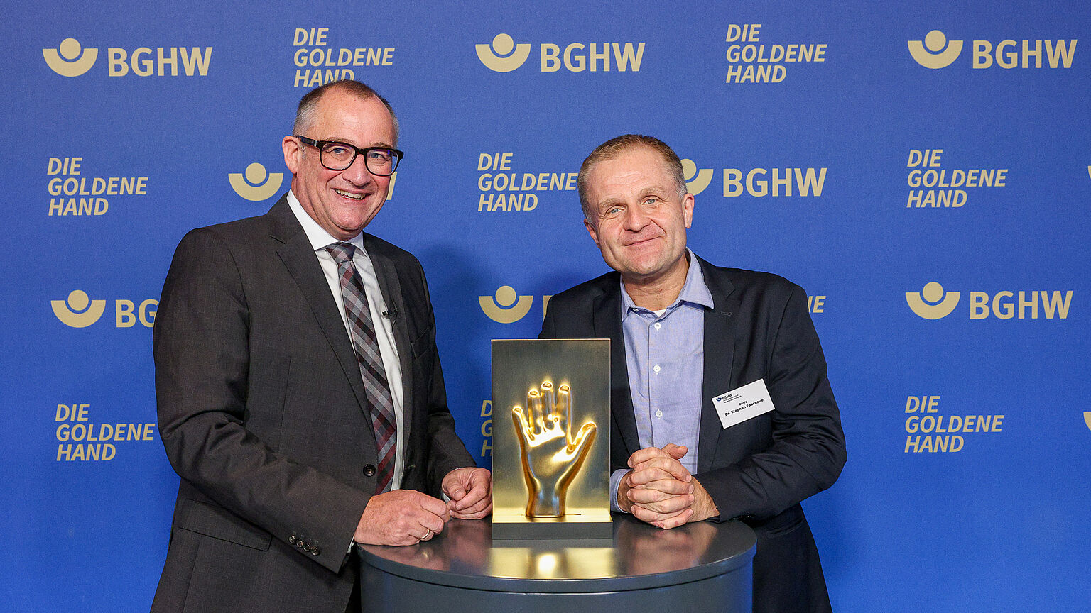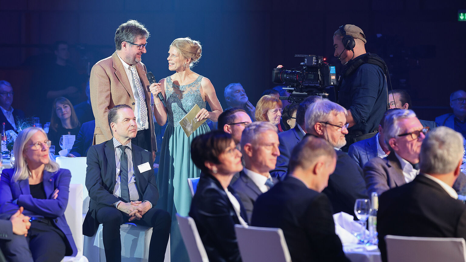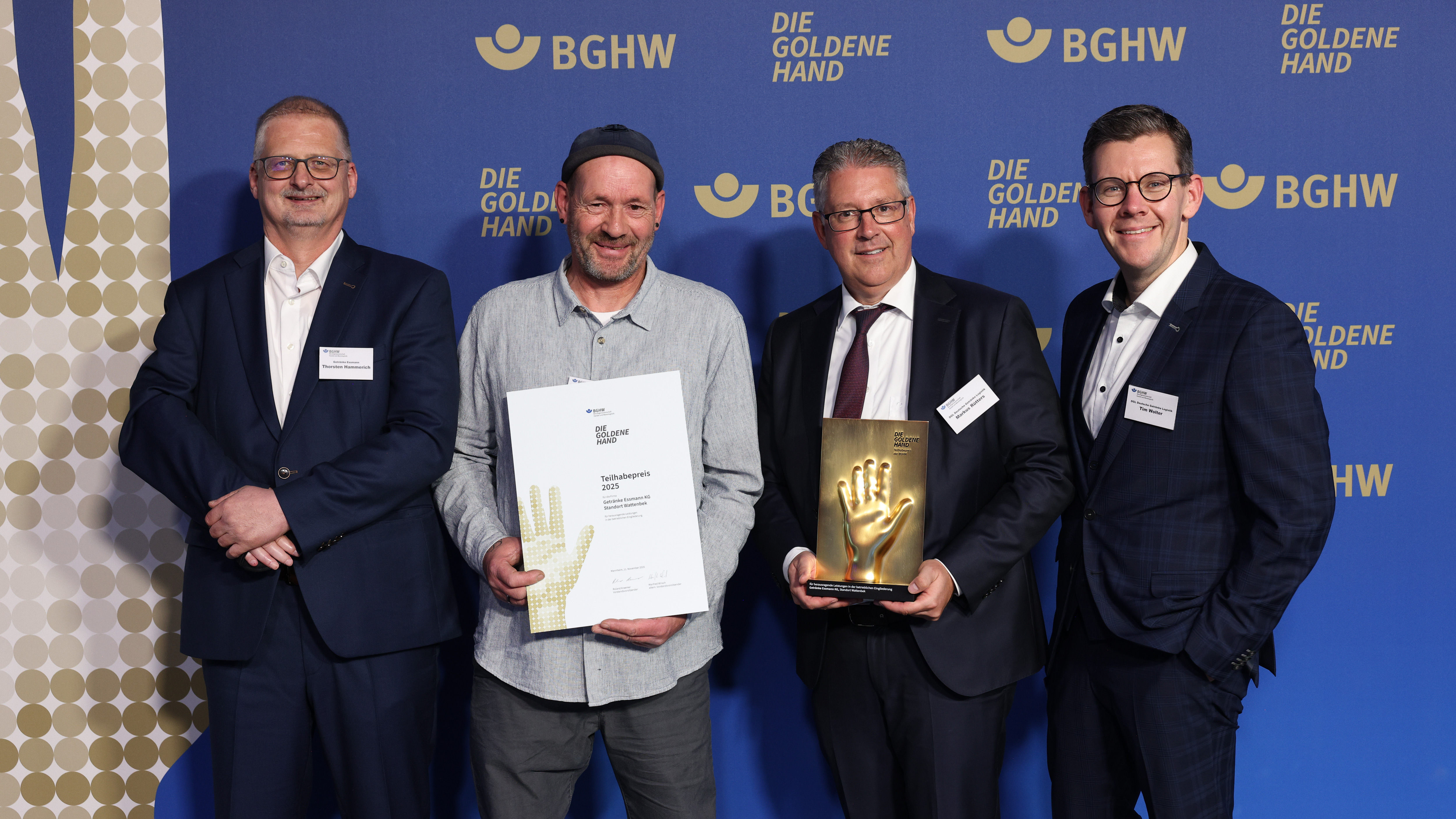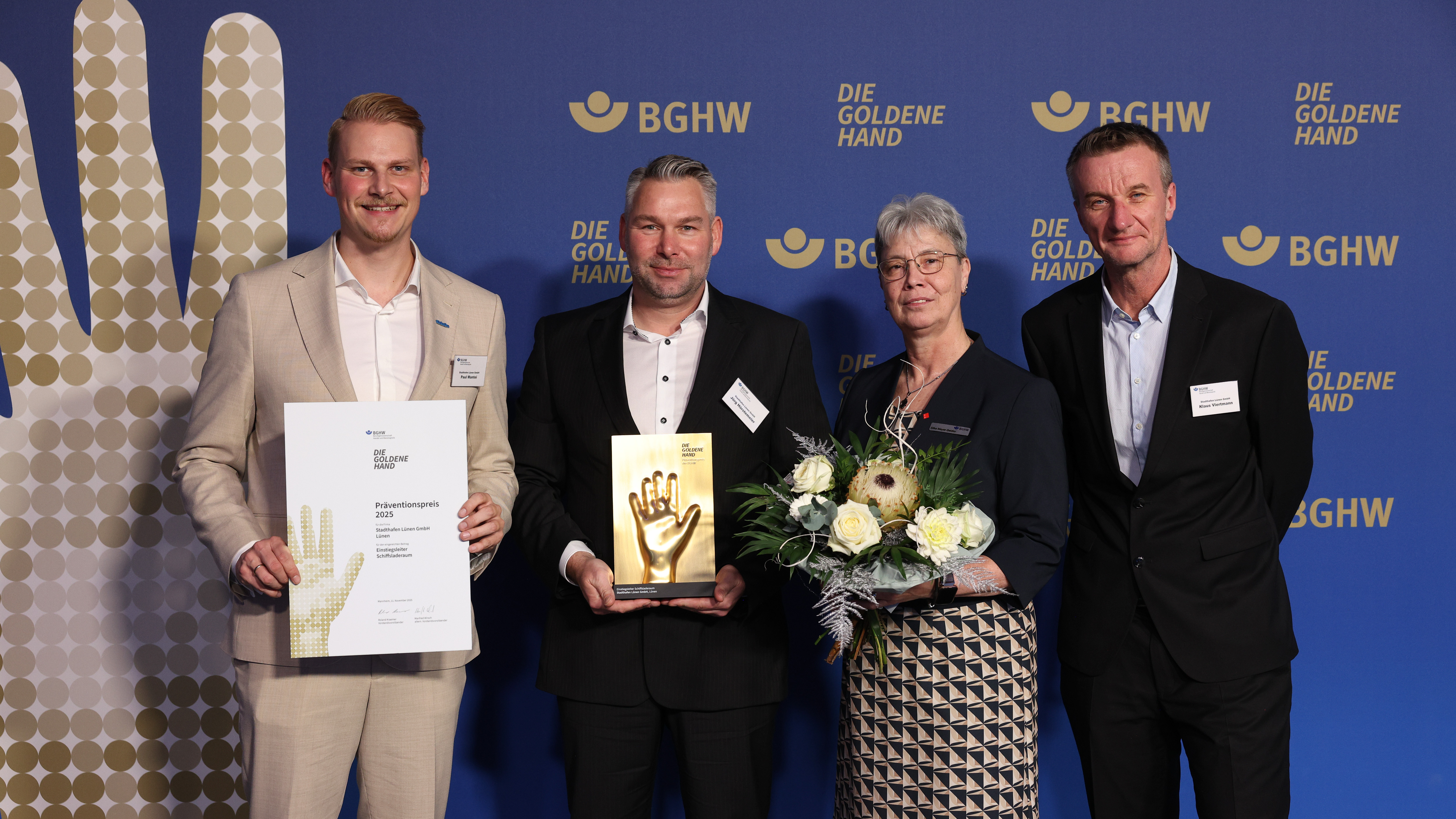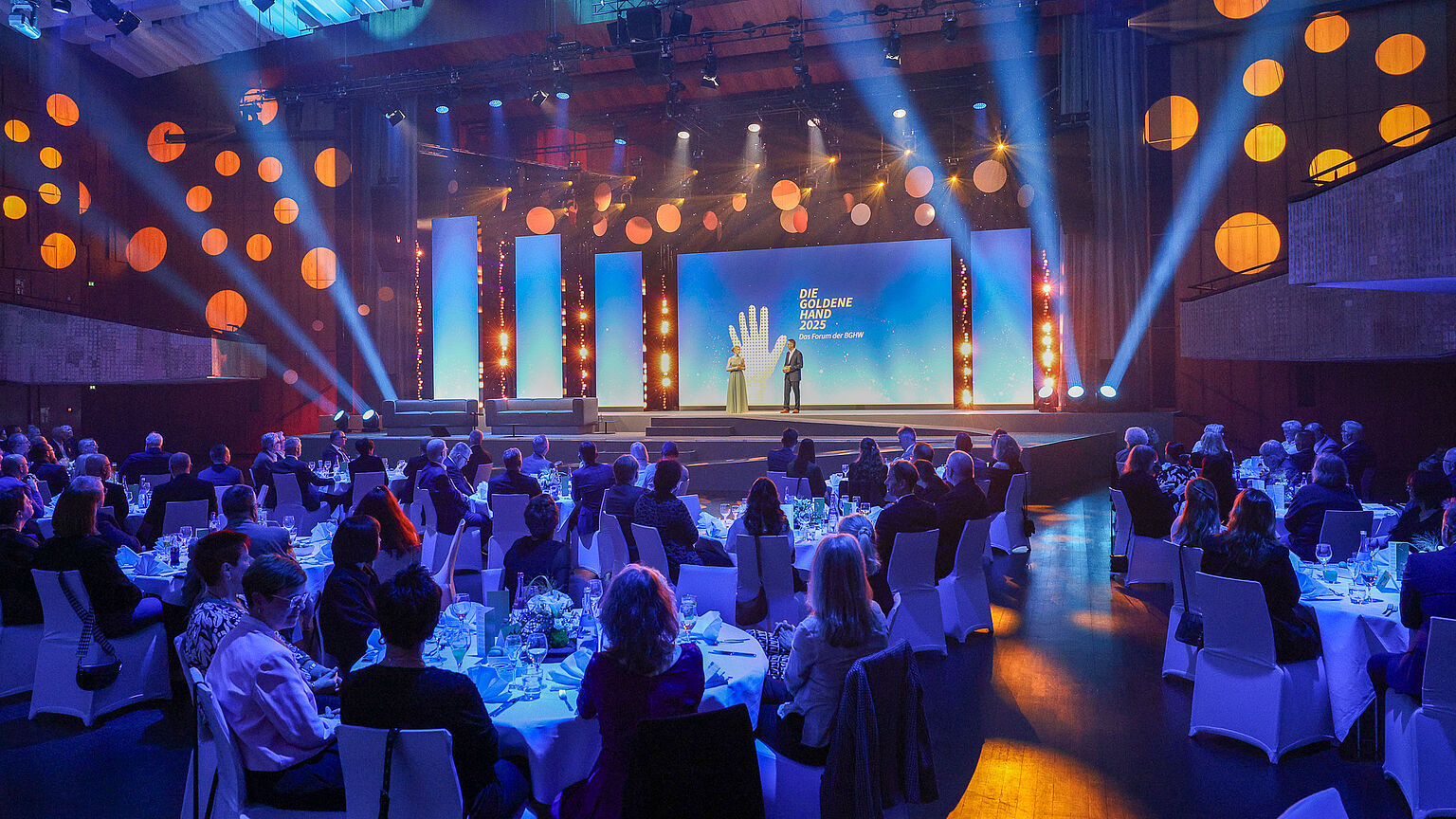 Die Preisträgerinnen und Preisträger der Goldenen Hand 2025 mit ihren Patinnen und Paten, sowie dem Moderationsduo Iris Stelter und Karl-Josef Thielen