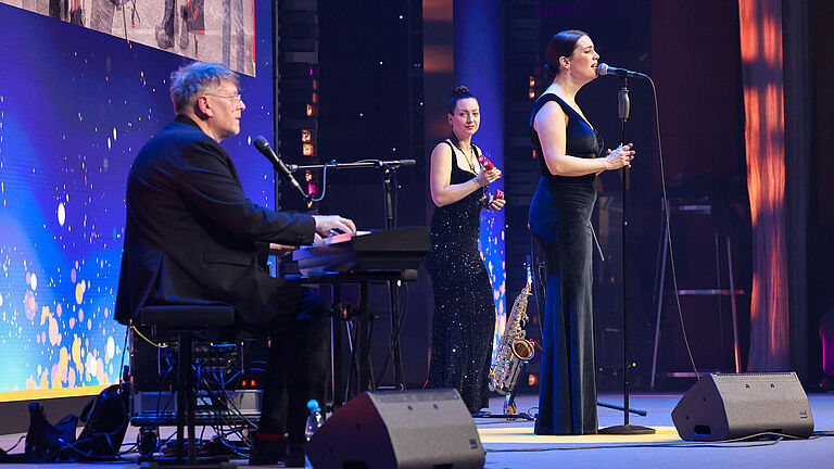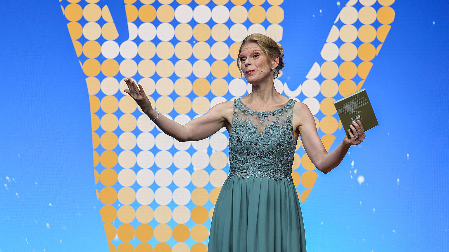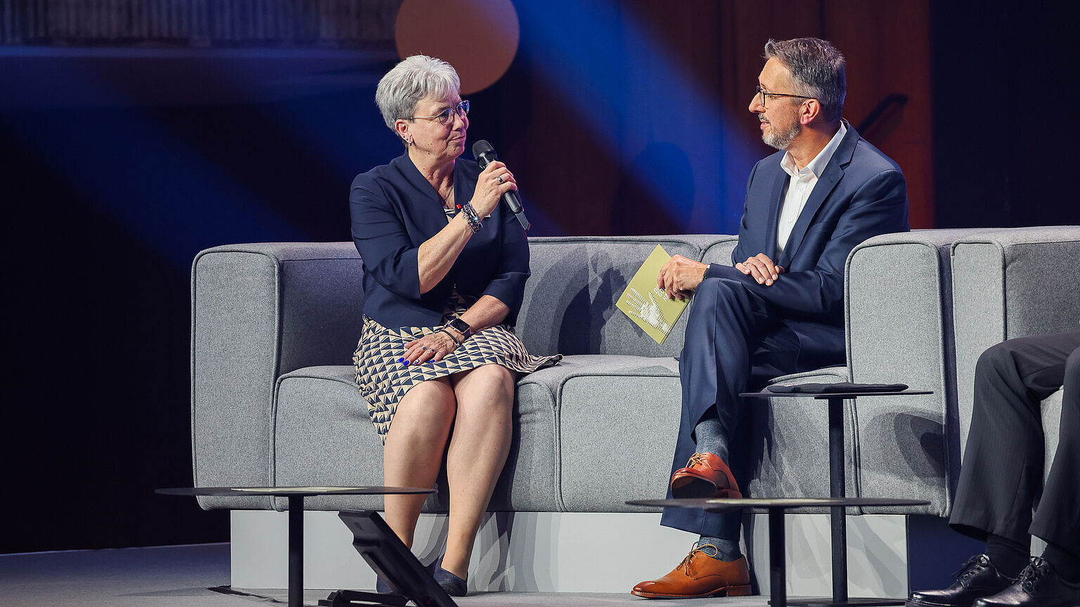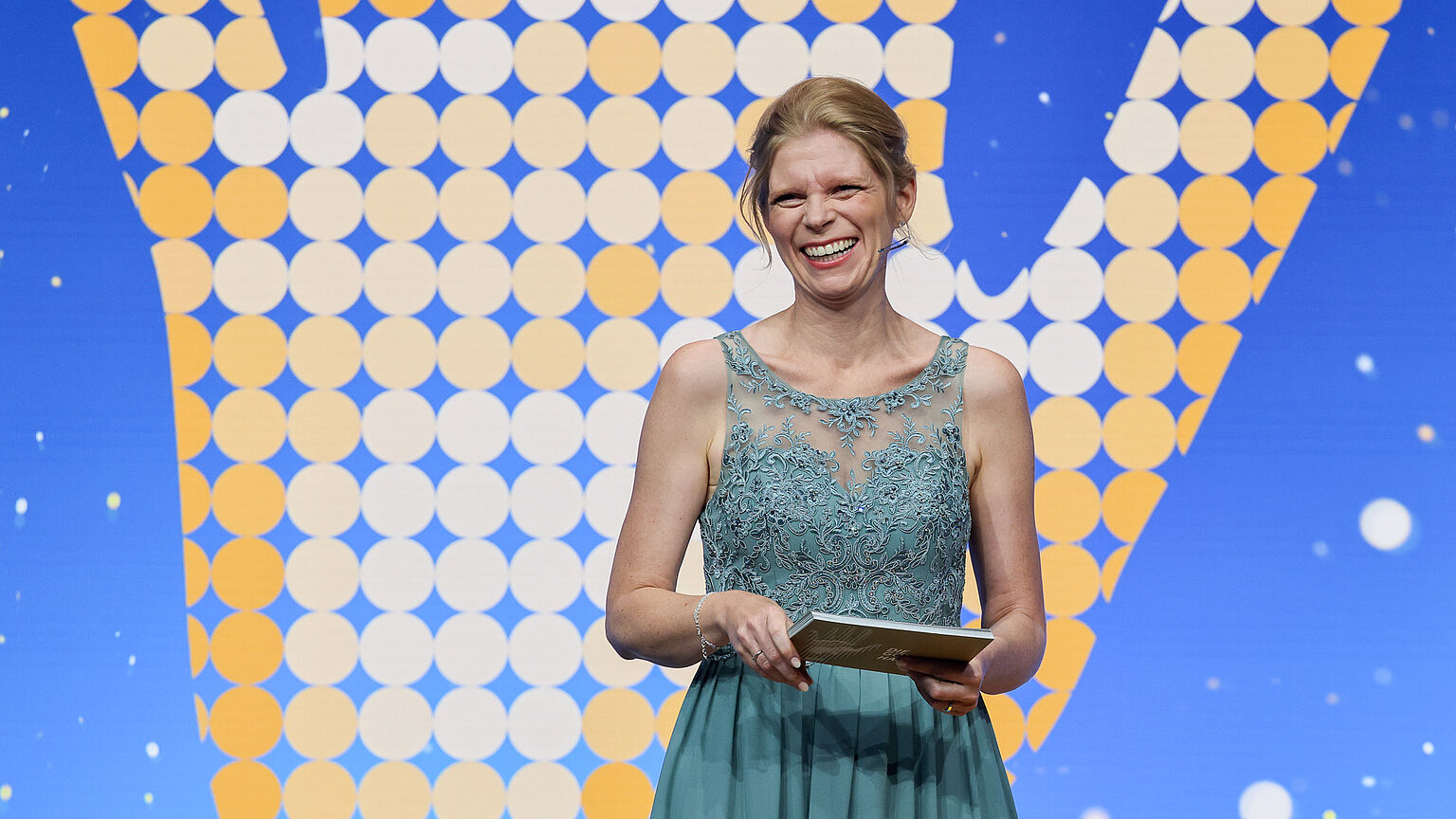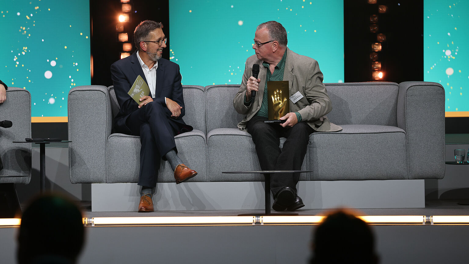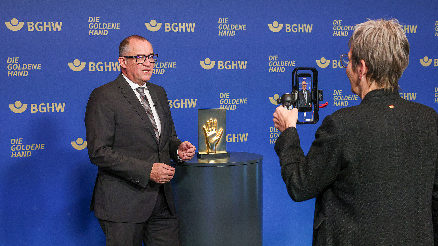 Die Preisträgerinnen und Preisträger der Goldenen Hand 2025 mit ihren Patinnen und Paten, sowie dem Moderationsduo Iris Stelter und Karl-Josef Thielen